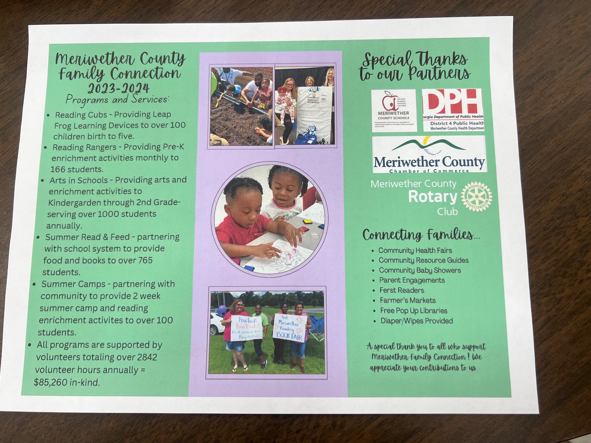 In collaboration with partners such as Meriwether Family Connections, the Meriwether County Chamber of Commerce, the Meriwether County School System, and the leaders of early literacy programs, this grant will provide early literacy resources and hands-on support to enhance their readiness for pre-K.